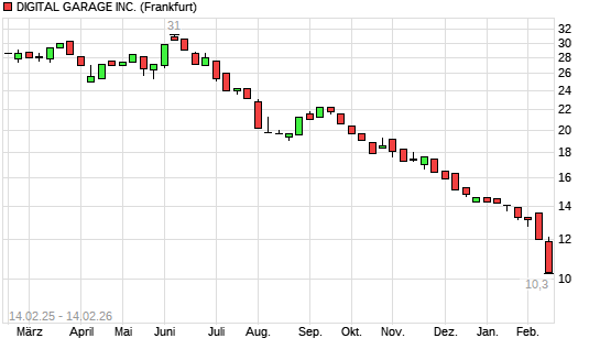 Mit dem Rücksetzer auf 10,50 EUR hat die Digital Garage-Aktie (ISIN JP3549070005) am 13.02.2026 ein neues 10-Jahres-Tief erreicht und damit den Kurs vom 06.02.2026 eingestellt.