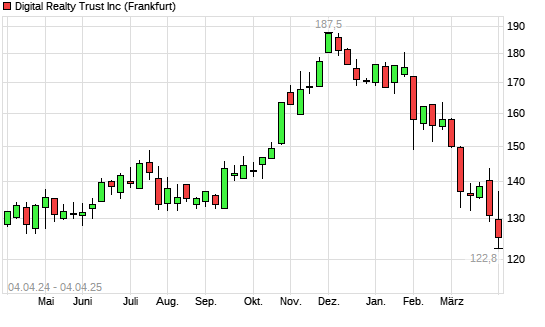 Mit dem Rücksetzer auf 127,48 EUR hat die Digital Realty Trust-Aktie (ISIN US2538681030) am 03.04.2025 ein neues 6-Monats-Tief erreicht und damit den Kurs vom 28.03.2025 eingestellt.