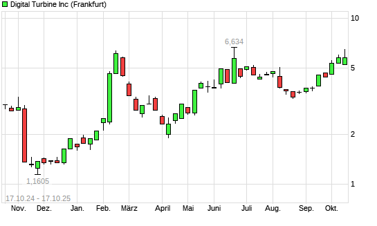 Mit dem Anstieg auf 6,52 EUR hat die Digital Turbine-Aktie (ISIN US25400W1027) am 16.10.2025 ein neues 12-Monats-Hoch erreicht und damit den Kurs vom 17.06.2025 eingestellt.