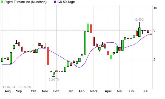 Mit dem Rücksetzer auf 4,38 EUR hat die Digital Turbine-Aktie am 16.07.2025 die 50-Tage-Linie nach unten gekreuzt.