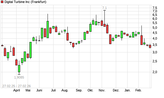 Mit dem Rücksetzer auf 3,26 EUR hat die Digital Turbine-Aktie (ISIN US25400W1027) am 26.02.2026 ein neues 6-Monats-Tief erreicht und damit den Kurs vom 18.02.2026 ...weiterlesen