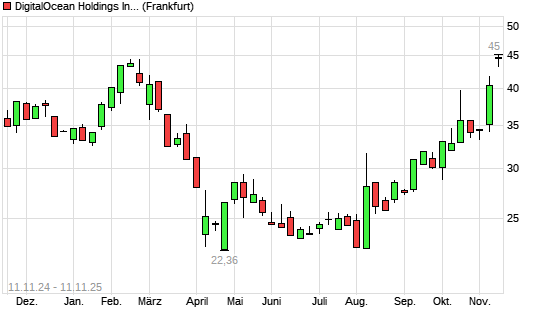 Mit dem Anstieg auf 44,60 EUR hat die DigitalOcean Holdings-Aktie (ISIN US25402D1028) am 10.11.2025 ein neues 3-Jahres-Hoch erreicht und damit den Kurs vom 31.07.2023 eingestellt.