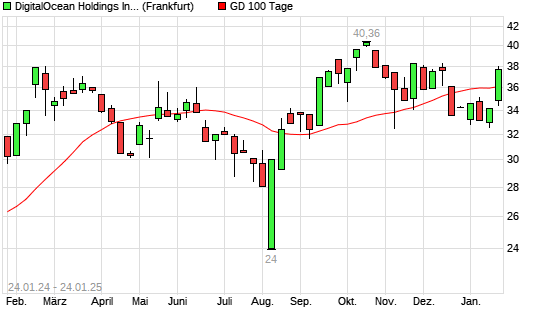 Mit dem Anstieg auf 36,77 EUR hat die DigitalOcean Holdings-Aktie am 23.01.2025 die 100-Tage-Linie nach oben gekreuzt.