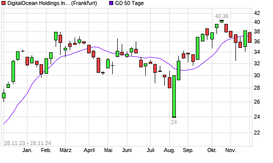 Mit dem Rücksetzer auf 36,71 EUR hat die DigitalOcean Holdings-Aktie am 27.11.2024 die 50-Tage-Linie nach unten gekreuzt.