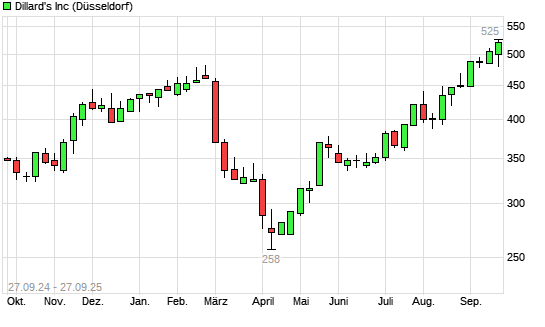 Mit dem Anstieg auf 520,00 EUR hat die Dillards A-Aktie (ISIN US2540671011) am 26.09.2025 ein neues All-Time-High erreicht und damit den Kurs vom 25.09.2025 eingestellt.