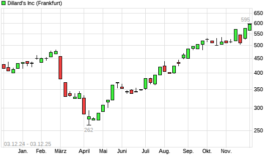 Mit dem Anstieg auf 595,00 EUR hat die Dillards A-Aktie (ISIN US2540671011) am 02.12.2025 ein neues All-Time-High erreicht und damit den Kurs vom 27.11.2025 eingestellt.