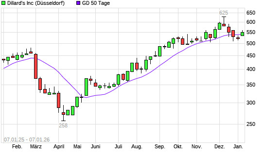 Mit dem Anstieg auf 545,00 EUR hat die Dillards A-Aktie am 06.01.2026 die 50-Tage-Linie nach oben gekreuzt.