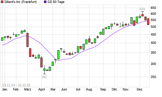 Mit dem Rücksetzer auf 540,00 EUR hat die Dillards A-Aktie am 22.12.2025 die 50-Tage-Linie nach unten gekreuzt.Die Dillards A-Aktie befindet sich seit dem 17.07.2025 im langfristigen Aufwärtstrend ...weiterlesen