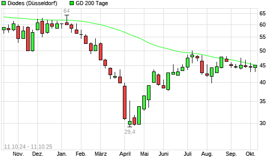 Mit dem Anstieg auf 44,80 EUR hat die Diodes-Aktie am 10.10.2025 die 200-Tage-Linie nach oben gekreuzt.
