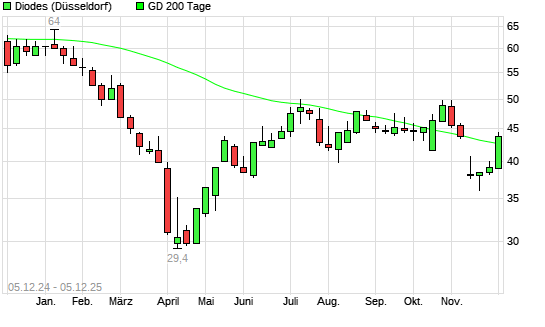 Mit dem Anstieg auf 43,40 EUR hat die Diodes-Aktie am 04.12.2025 die 200-Tage-Linie nach oben gekreuzt.