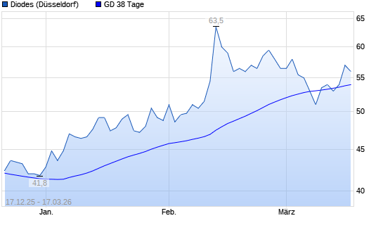 Mit dem Anstieg auf 56,00 EUR hat die Diodes-Aktie am 16.03.2026 die 38-Tage-Linie nach oben gekreuzt.