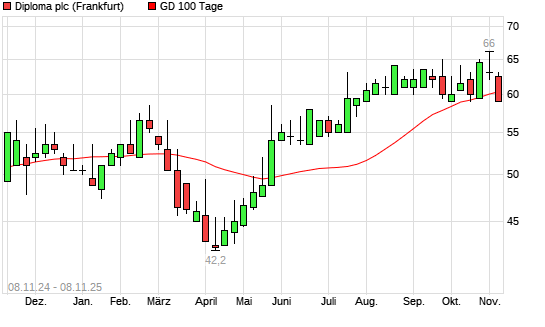 Mit dem Rücksetzer auf 59,00 EUR hat die Diploma-Aktie am 07.11.2025 die 100-Tage-Linie nach unten gekreuzt.