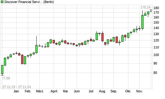 Mit dem Anstieg auf 173,18 EUR hat die Discover Financial Services-Aktie (ISIN US2547091080) am 26.11.2024 ein neues All-Time-High erreicht und damit den Kurs vom 11.11.2024 eingestellt.