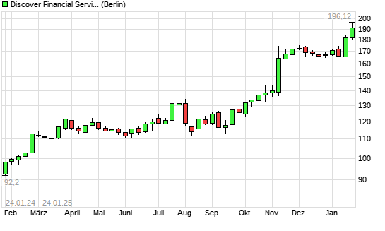 Mit dem Anstieg auf 190,54 EUR hat die Discover Financial Services-Aktie (ISIN US2547091080) am 23.01.2025 ein neues All-Time-High erreicht und damit den Kurs vom 16.01.2025 eingestellt.