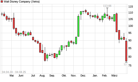Mit dem Rücksetzer auf 82,02 EUR hat die Disney-Aktie (ISIN US2546871060) am 03.04.2025 ein neues 6-Monats-Tief erreicht und damit den Kurs vom 07.10.2024 eingestellt.