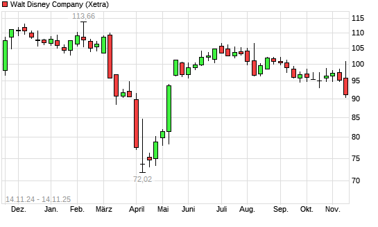 Mit dem Rücksetzer auf 92,33 EUR hat die Disney-Aktie (ISIN US2546871060) am 13.11.2025 ein neues 6-Monats-Tief erreicht und damit den Kurs vom 17.10.2025 eingestellt.