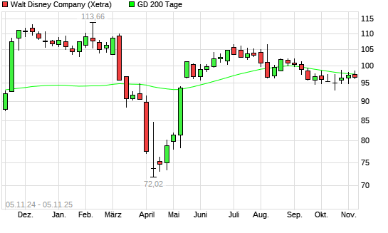 Mit dem Rücksetzer auf 97,05 EUR hat die Disney-Aktie am 04.11.2025 die 200-Tage-Linie nach unten gekreuzt.