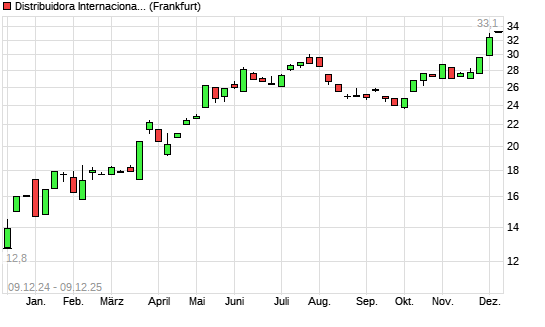 Mit dem Anstieg auf 33,10 EUR hat die Distribuidora Internacional de Alimentacion-Aktie (ISIN ES0126775008) am 08.12.2025 ein neues 3-Jahres-Hoch erreicht und damit den Kurs vom 04.12.2025 eingestellt.