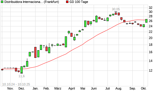 Mit dem Anstieg auf 26,75 EUR hat die Distribuidora Internacional de Alimentacion-Aktie am 09.10.2025 die 100-Tage-Linie nach oben gekreuzt.