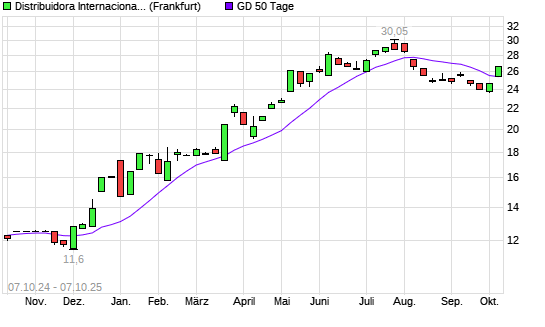 Mit dem Anstieg auf 25,50 EUR hat die Distribuidora Internacional de Alimentacion-Aktie am 06.10.2025 die 50-Tage-Linie nach oben gekreuzt.