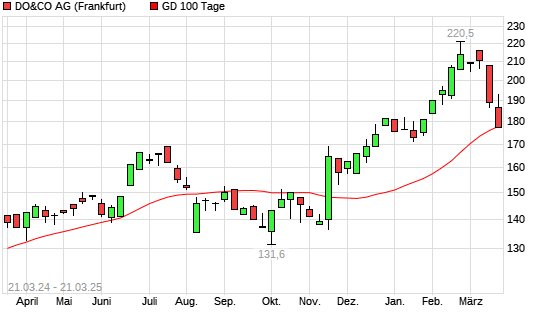 Mit dem Rücksetzer auf 177,20 EUR hat die Do & Co-Aktie am 20.03.2025 die 100-Tage-Linie nach unten gekreuzt.