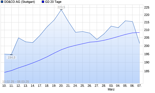 Mit dem Rücksetzer auf 201,50 EUR hat die Do & Co-Aktie am 07.03.2025 die 20-Tage-Linie nach unten gekreuzt.