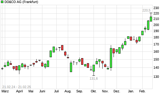 Mit dem Anstieg auf 223,50 EUR hat die Do & Co-Aktie (ISIN AT0000818802) am 20.02.2025 ein neues All-Time-High erreicht und damit den Kurs vom 19.02.2025 eingestellt.Die Do & Co-Aktie befindet ...weiterlesen