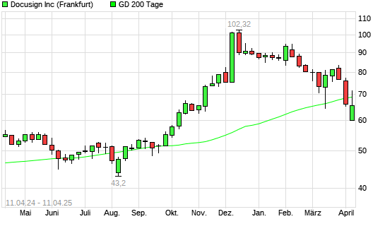 Mit dem Rücksetzer auf 65,32 EUR hat die Docusign-Aktie am 10.04.2025 die 200-Tage-Linie nach unten gekreuzt.