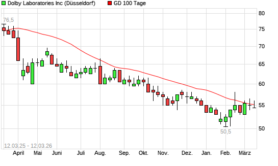 Mit dem Rücksetzer auf 55,00 EUR hat die Dolby-Aktie am 11.03.2026 die 100-Tage-Linie nach unten gekreuzt.