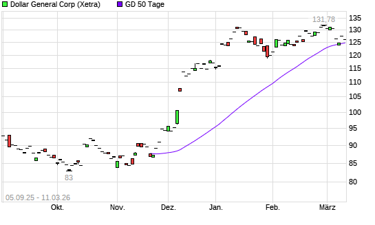 Mit dem Rücksetzer auf 124,26 EUR hat die Dollar General-Aktie am 10.03.2026 die 50-Tage-Linie nach unten gekreuzt.