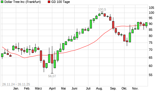 Mit dem Anstieg auf 91,12 EUR hat die Dollar Tree-Aktie am 25.11.2025 die 100-Tage-Linie nach oben gekreuzt.