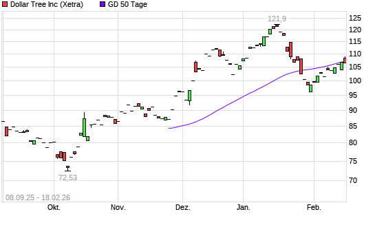 Mit dem Anstieg auf 108,46 EUR hat die Dollar Tree-Aktie am 17.02.2026 die 50-Tage-Linie nach oben gekreuzt.