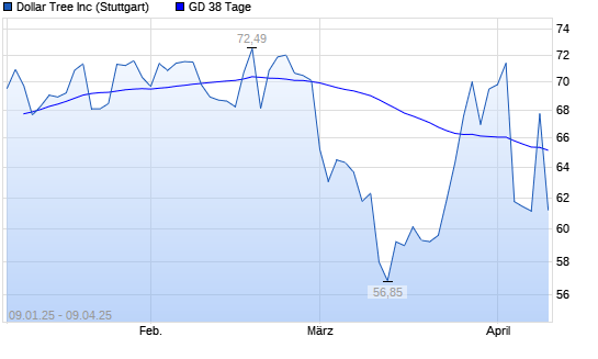 Mit dem Rücksetzer auf 63,37 EUR hat die Dollar Tree-Aktie am 08.04.2025 die 38-Tage-Linie nach unten gekreuzt.