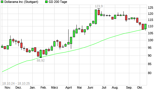Mit dem Anstieg auf 108,85 EUR hat die Dollarama-Aktie am 17.10.2025 die 200-Tage-Linie nach oben gekreuzt.