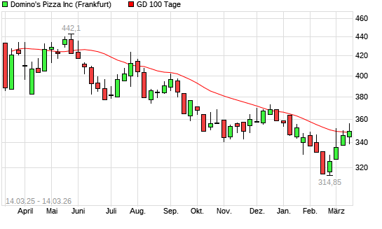Mit dem Anstieg auf 349,75 EUR hat die Domino's-Aktie am 13.03.2026 die 100-Tage-Linie nach oben gekreuzt.