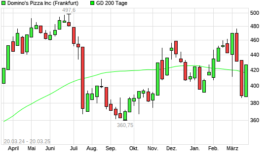 Mit dem Anstieg auf 415,45 EUR hat die Domino's-Aktie am 19.03.2025 die 200-Tage-Linie nach oben gekreuzt.