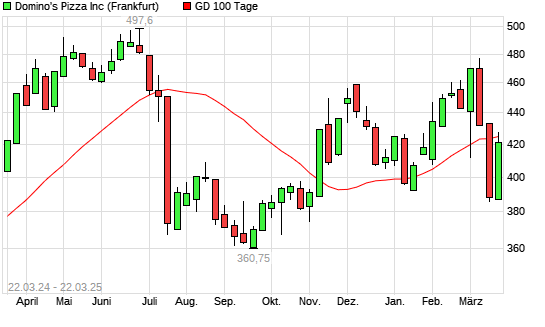 Mit dem Rücksetzer auf 420,85 EUR hat die Domino's-Aktie am 21.03.2025 die 100-Tage-Linie nach unten gekreuzt.
