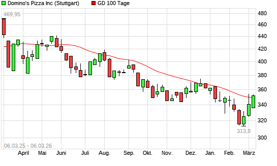 Mit dem Rücksetzer auf 348,85 EUR hat die Domino's-Aktie am 05.03.2026 die 100-Tage-Linie nach unten gekreuzt.