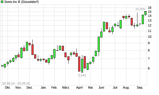 Mit dem Anstieg auf 14,91 EUR hat die Domo-Aktie (ISIN US2575541055) am 19.09.2025 ein neues 12-Monats-Hoch erreicht und damit den Kurs vom 27.08.2025 eingestellt.