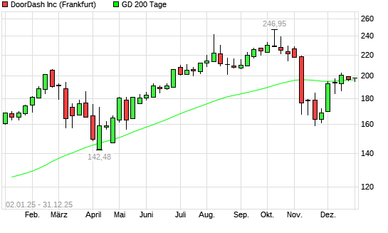 Mit dem Anstieg auf 197,74 EUR hat die DoorDash-Aktie am 30.12.2025 die 200-Tage-Linie nach oben gekreuzt.