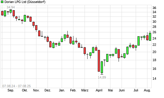 Mit dem Anstieg auf 26,49 EUR hat die Dorian LPG-Aktie (ISIN MHY2106R1100) am 06.08.2025 ein neues 6-Monats-Hoch erreicht und damit den Kurs vom 29.07.2025 eingestellt.