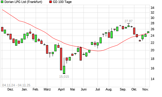 Mit dem Anstieg auf 24,93 EUR hat die Dorian LPG-Aktie am 03.11.2025 die 100-Tage-Linie nach oben gekreuzt.