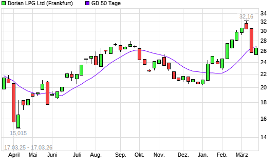 Mit dem Anstieg auf 26,92 EUR hat die Dorian LPG-Aktie am 16.03.2026 die 50-Tage-Linie nach oben gekreuzt.