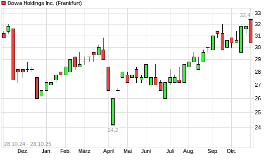 Mit dem Anstieg auf 32,40 EUR hat die Dowa Holdings-Aktie (ISIN JP3638600001) am 27.10.2025 ein neues 12-Monats-Hoch erreicht und damit den Kurs vom 07.11.2024 eingestellt.