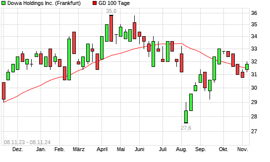 Mit dem Anstieg auf 32,00 EUR hat die Dowa Holdings-Aktie am 07.11.2024 die 100-Tage-Linie nach oben gekreuzt.