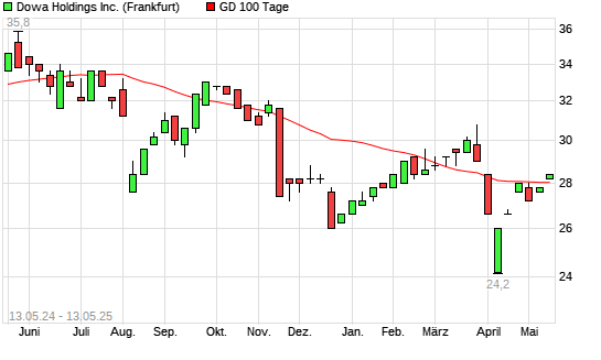 Mit dem Anstieg auf 28,20 EUR hat die Dowa Holdings-Aktie am 12.05.2025 die 100-Tage-Linie nach oben gekreuzt.