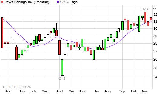 Mit dem Anstieg auf 31,60 EUR hat die Dowa Holdings-Aktie am 10.11.2025 die 50-Tage-Linie nach oben gekreuzt.