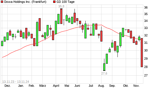 Mit dem Rücksetzer auf 29,20 EUR hat die Dowa Holdings-Aktie am 12.11.2024 die 100-Tage-Linie nach unten gekreuzt.