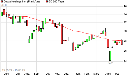Mit dem Rücksetzer auf 27,40 EUR hat die Dowa Holdings-Aktie am 14.05.2025 die 100-Tage-Linie nach unten gekreuzt.
