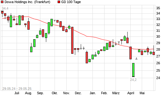 Mit dem Rücksetzer auf 27,60 EUR hat die Dowa Holdings-Aktie am 28.05.2025 die 100-Tage-Linie nach unten gekreuzt.